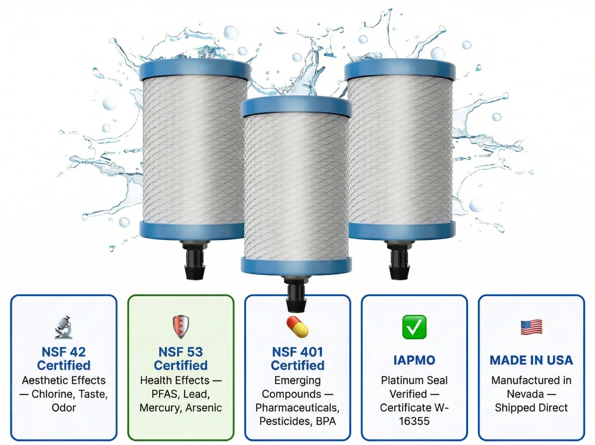 → Open Lab Report #23-56 (PDF)The counterfeit test: A fake has none of these. No official certification page on NSF.org. No verifiable 4Patriots origin. No lab report — or a "lab report" that tests just a few gallons or doesn't trace to an ANSI-accredited facility. If you're holding a replacement filter right now, check those 3 questions. Don't settle for anything less!